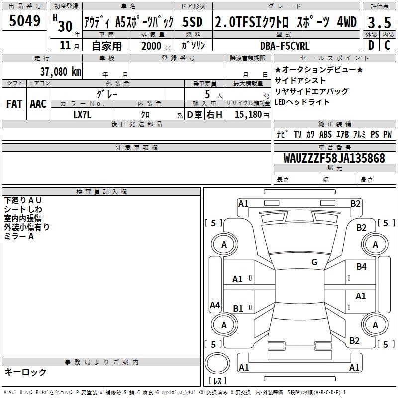 AUDI A5 SPORTBACK 2018 г., лот № 5049