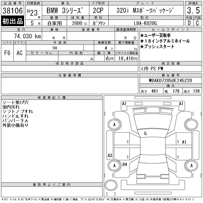Год выпуска2011 Пробег 74 000 км КузовKD20G Комплектация320I M SPORT PACKAGE