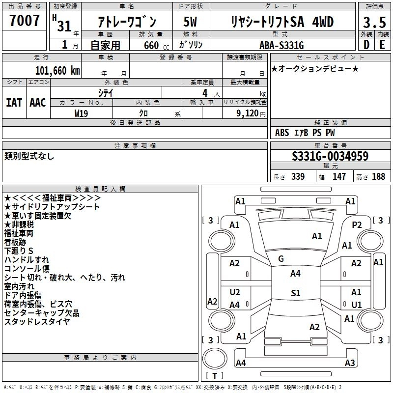 Год выпуска2019 Пробег 102 000 км КузовS331G Комплектация REAR SEAT LIFT "SA 4WD