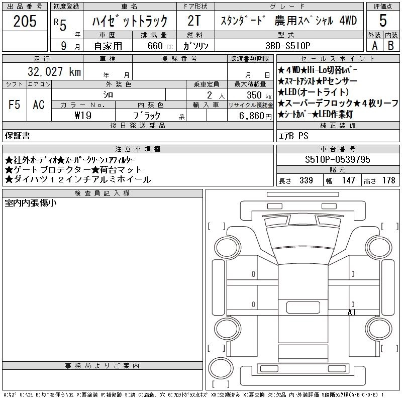 Год выпуска2023 Пробег 32 000 км КузовS510P Комплектация STANDARD NOUYOU SPEC 4WD