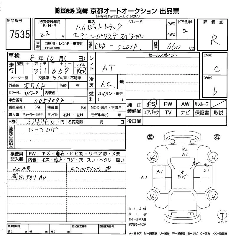 Год выпуска2010 Пробег 32 000 км КузовS201P Комплектация AIR CONDITIONER * POWER STEERING SPECIAL