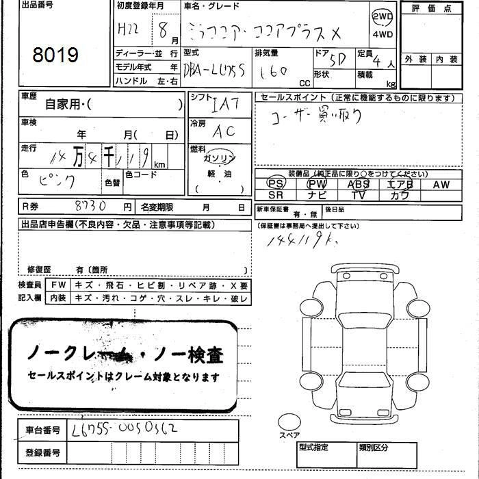 DAIHATSU MIRA COCOA 2010 г., лот № 8019