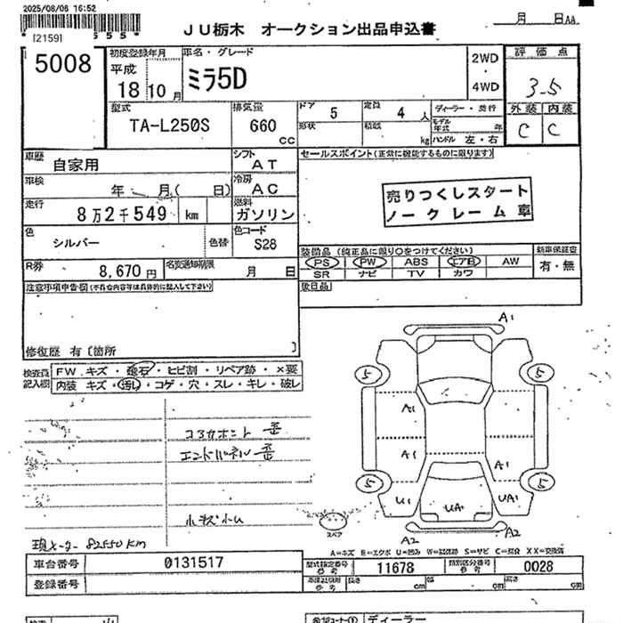 Статус выставлен на аукцион Лот 5008 Аукцион JU Tochigi Дата аукциона 12.12.2025