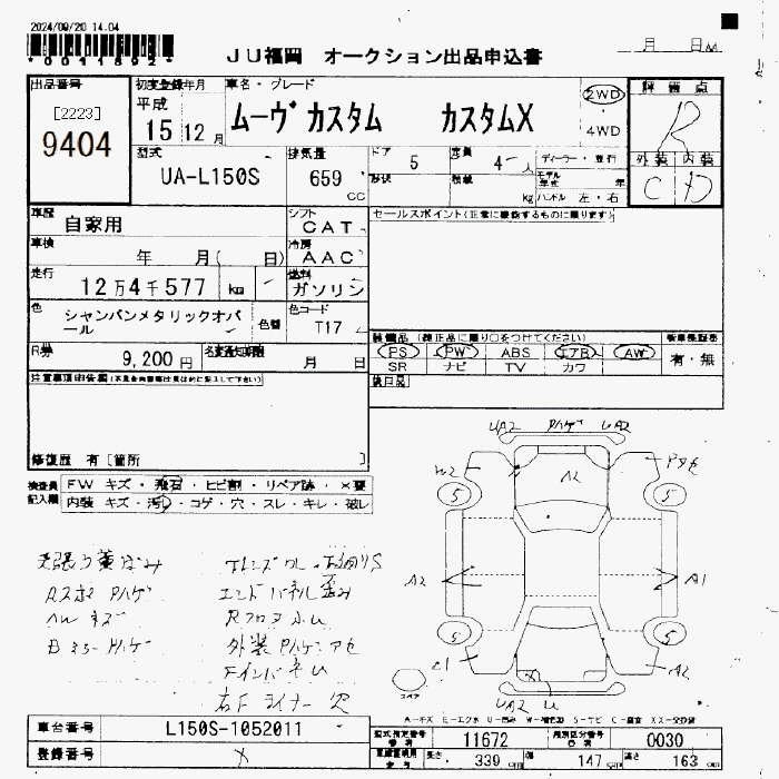 Статус не продан Лот 9404 Аукцион JU Fukuoka Дата аукциона 14.11.2025
