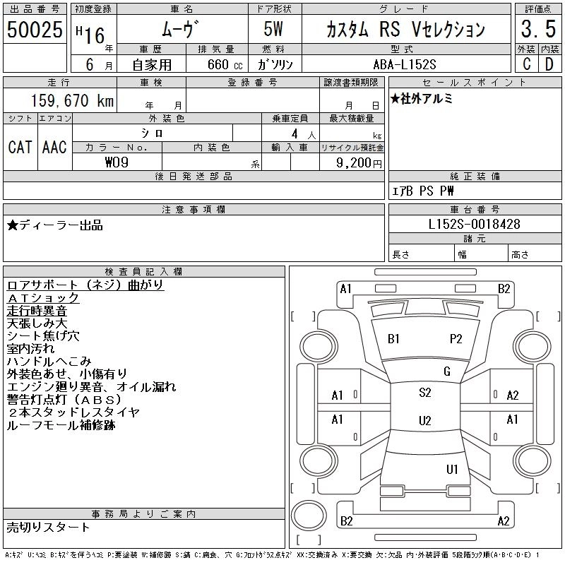 Год выпуска2004 Пробег 160 000 км КузовL152S Комплектация CUSTOM RS V SELECTION