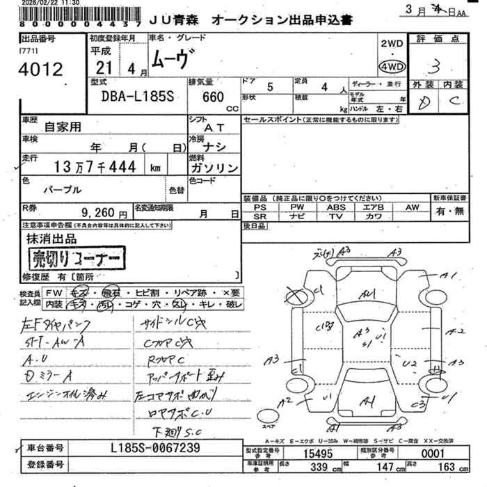 Статус выставлен на аукцион Лот 4012 Аукцион JU Aomori Дата аукциона 11.03.2026