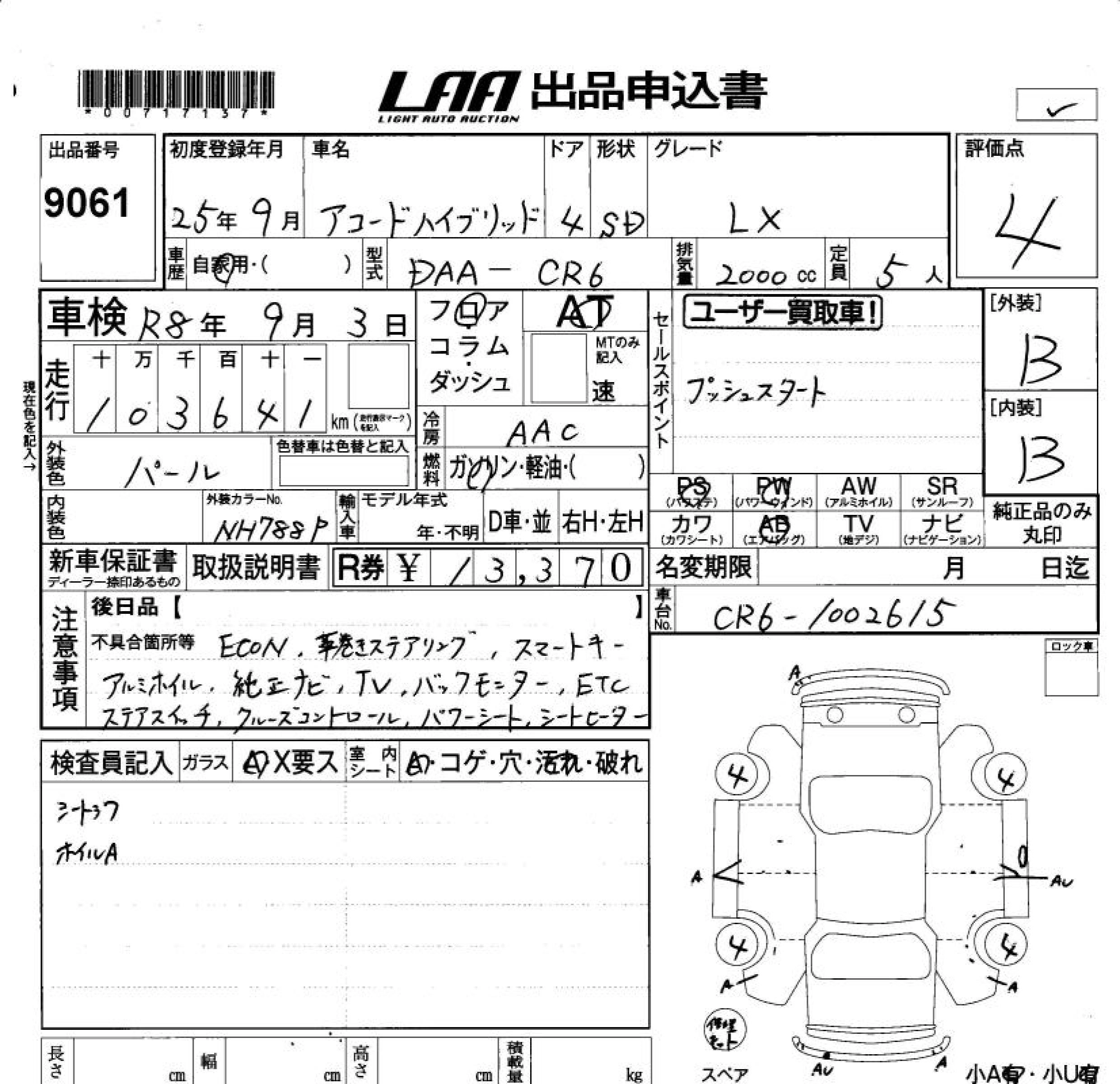 HONDA ACCORD HYBRID 2013 г., лот № 9061