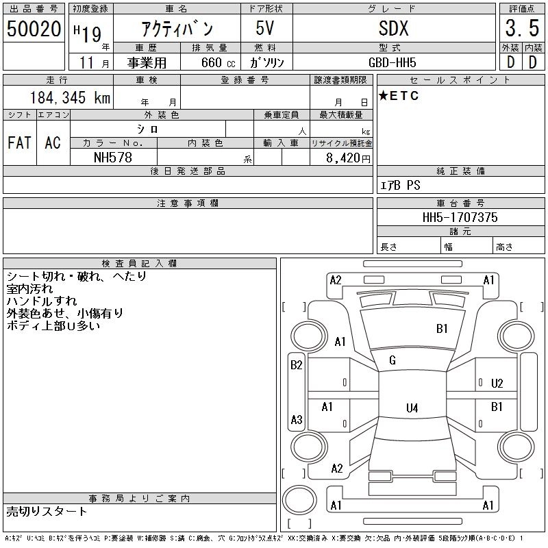 HONDA ACTY VAN 2007 г., лот № 50020
