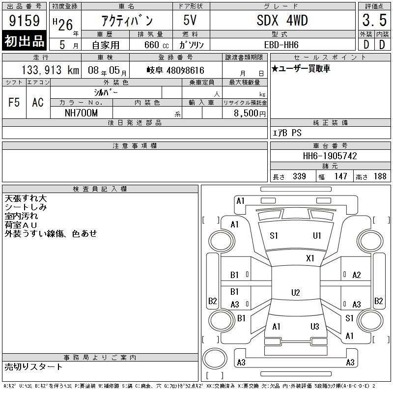 HONDA ACTY VAN 2014 г., лот № 9159