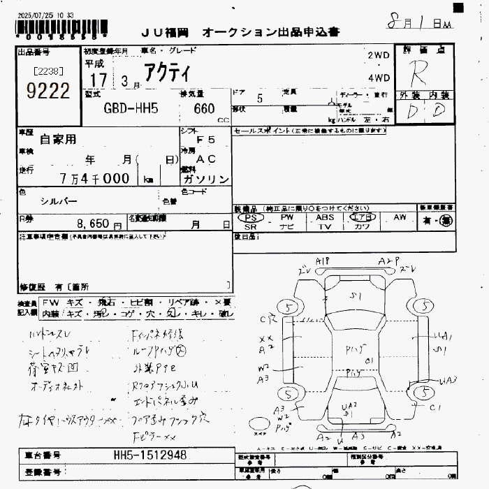 Статус выставлен на аукцион Лот 9222 Аукцион JU Fukuoka Дата аукциона 13.03.2026