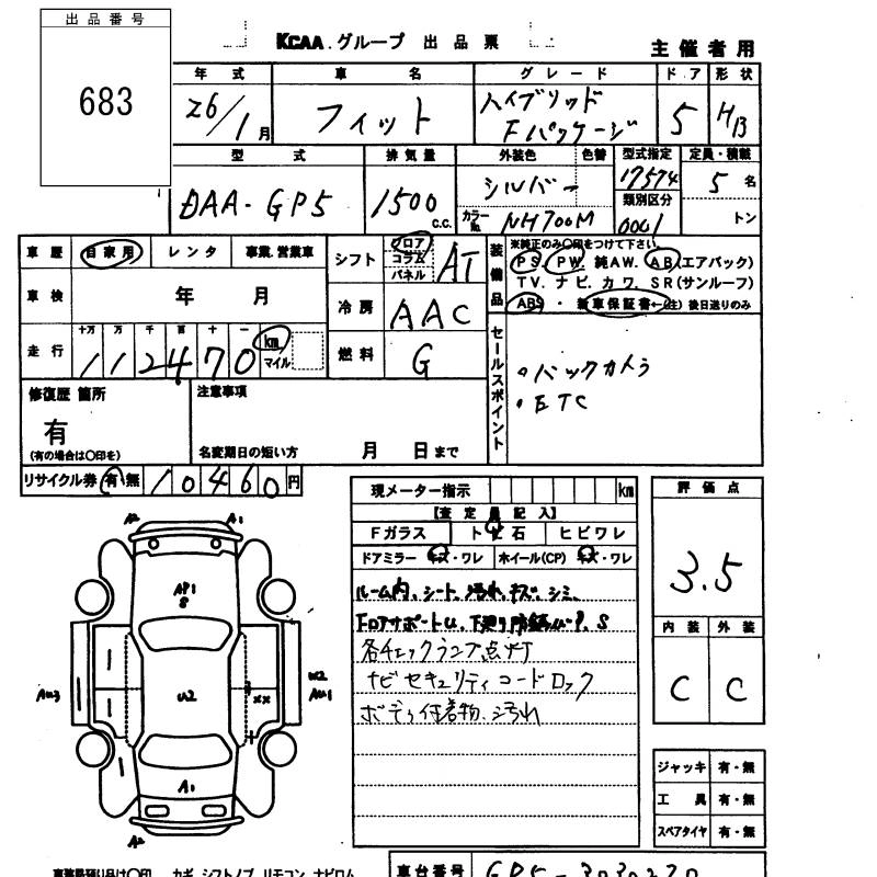 HONDA FIT HYBRID 2014 г., лот № 683