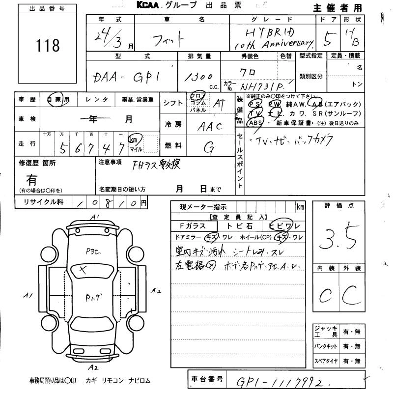 HONDA FIT HYBRID 2012 г., лот № 118