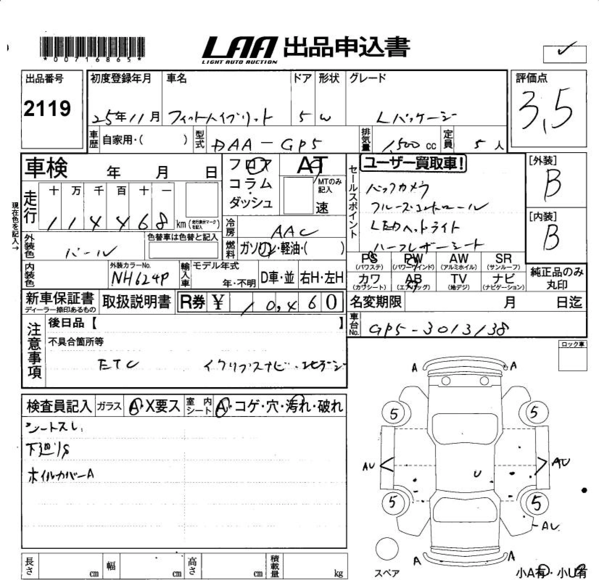 HONDA FIT HYBRID 2013 г., лот № 2119