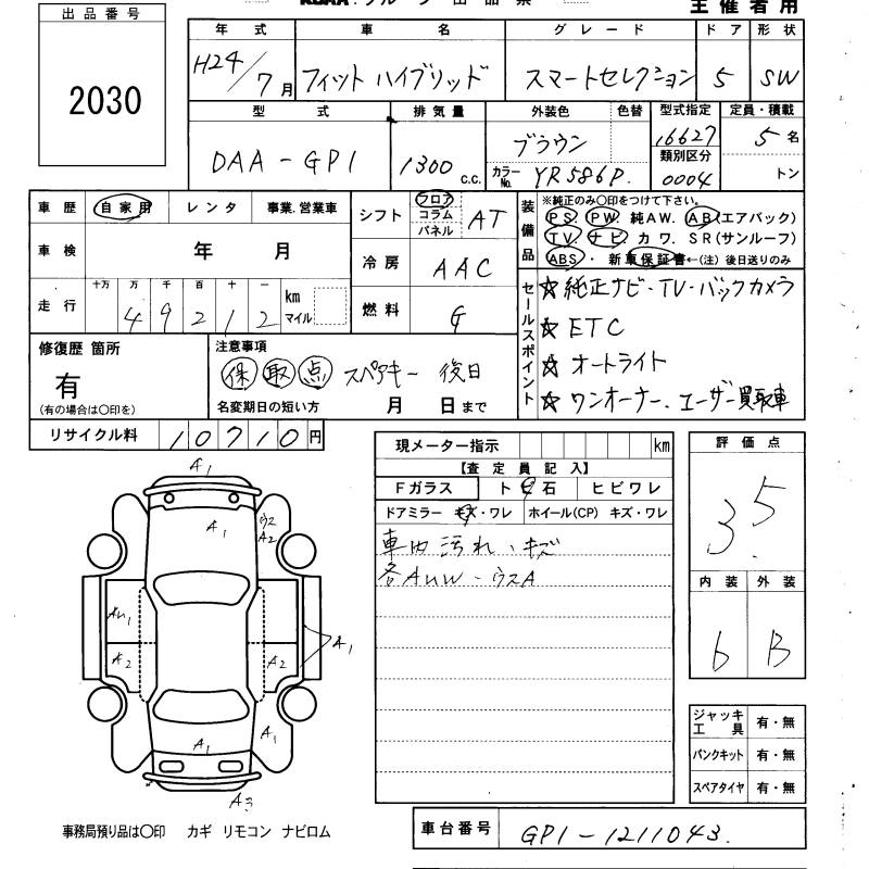 HONDA FIT HYBRID 2012 г., лот № 2030