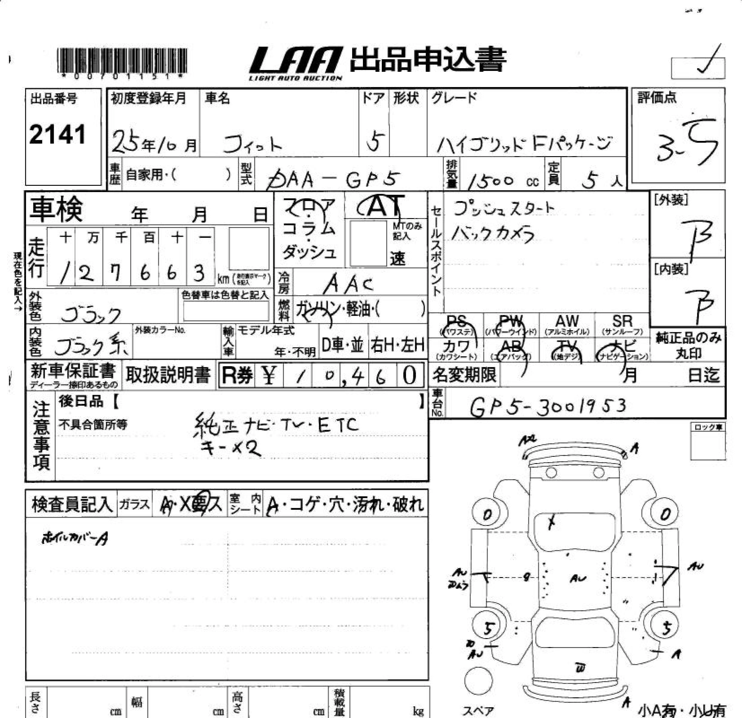HONDA FIT HYBRID 2013 г., лот № 2141