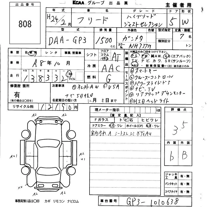 HONDA FREED HYBRID 2012 г., лот № 808