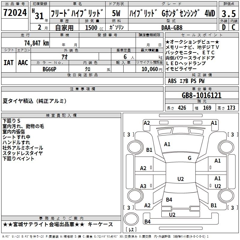 HONDA FREED HYBRID 2019 г., лот № 72024