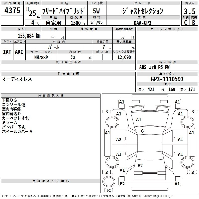 HONDA FREED HYBRID 2013 г., лот № 4375