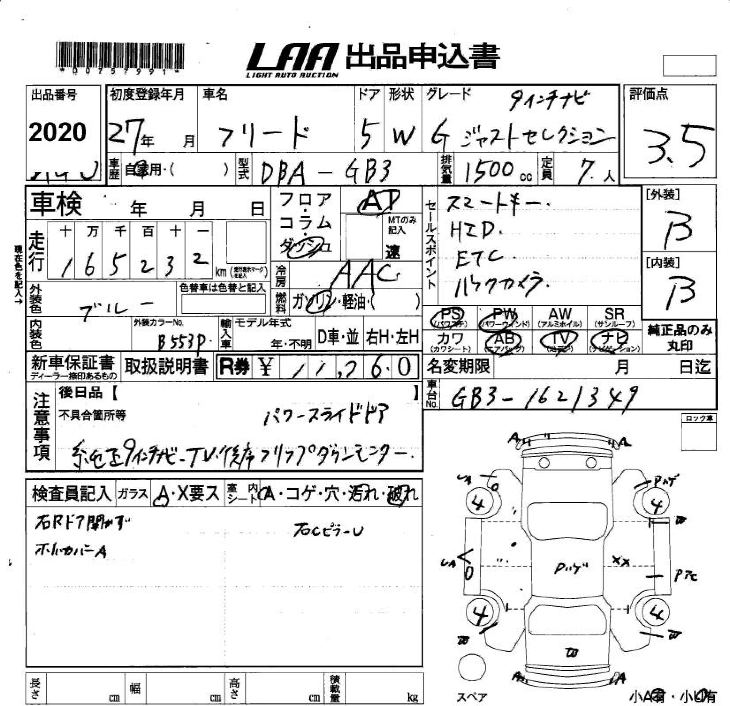 HONDA FREED 2015 г., лот № 2020