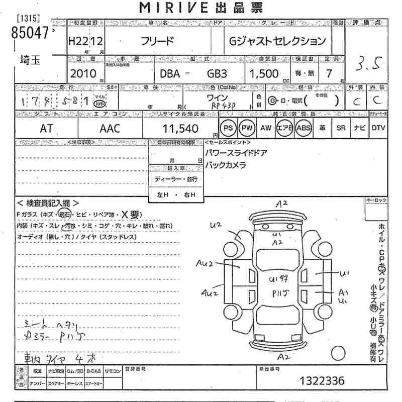 HONDA FREED 2010 г., лот № 85047
