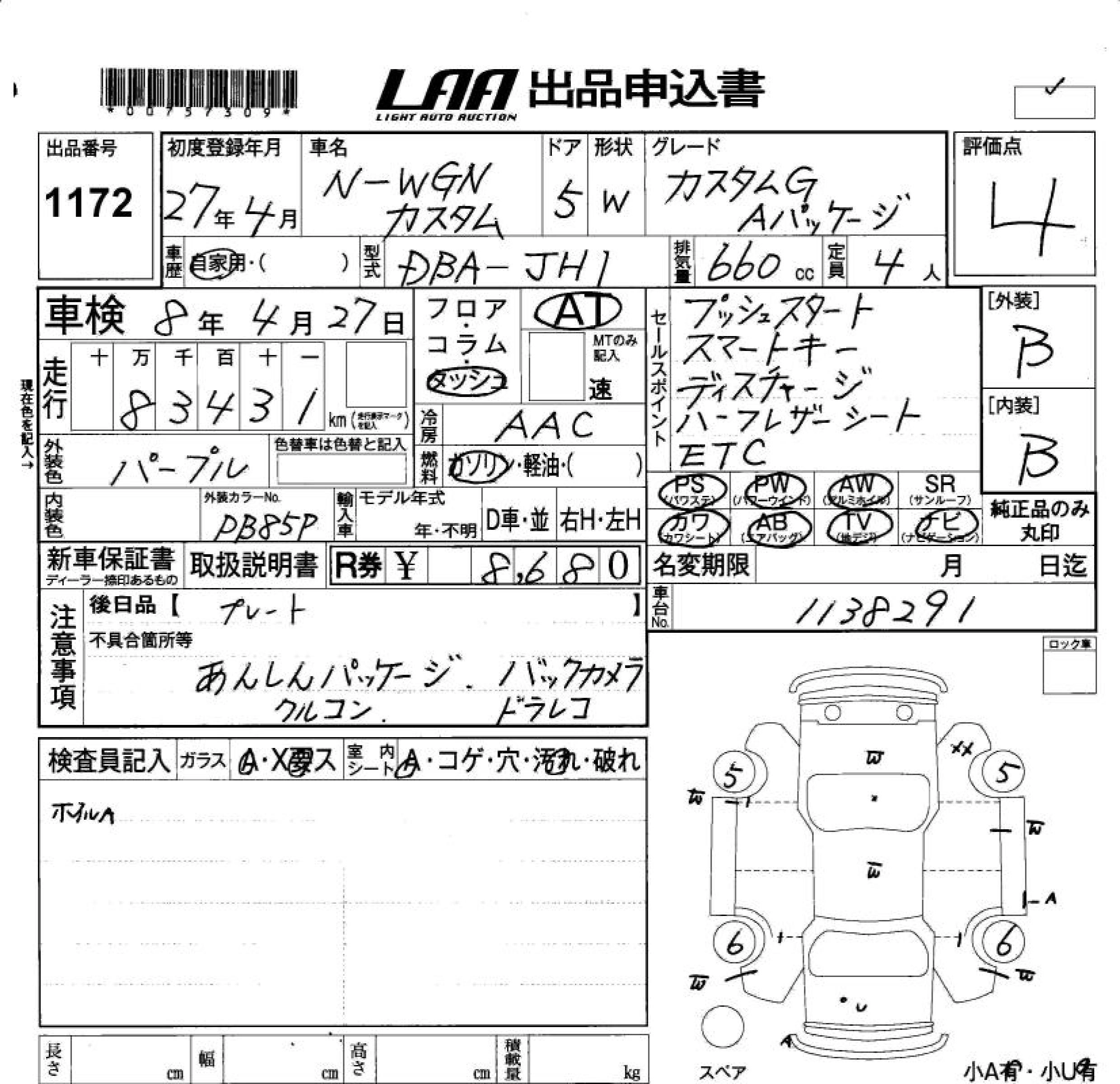 HONDA N-WGN 2015 г., лот № 1172