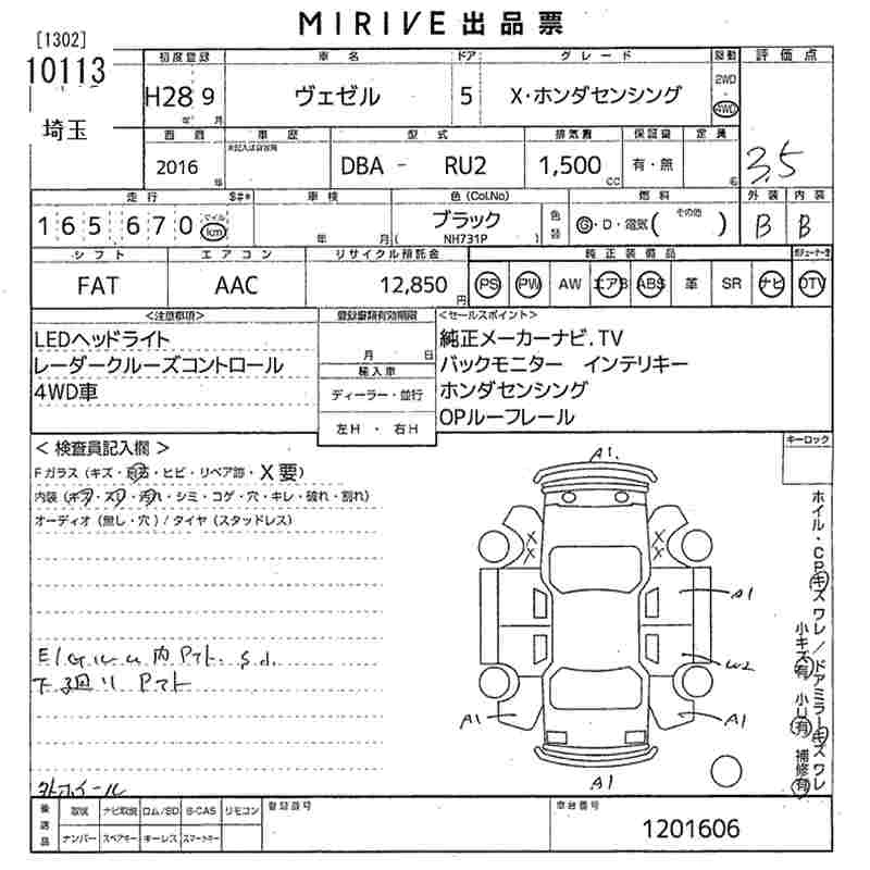 HONDA VEZEL 2016 г., лот № 10113