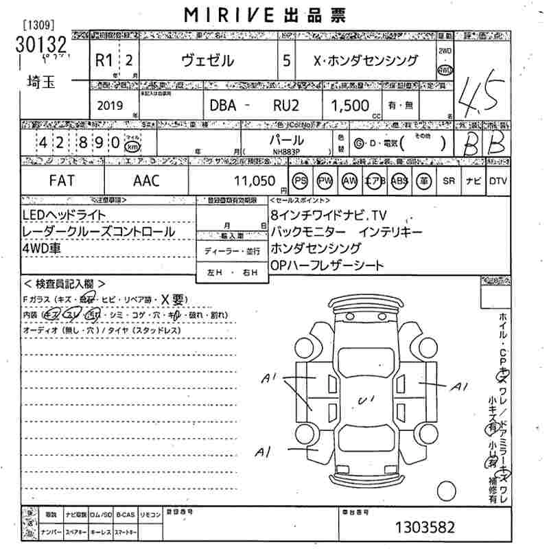 HONDA VEZEL 2019 г., лот № 30132