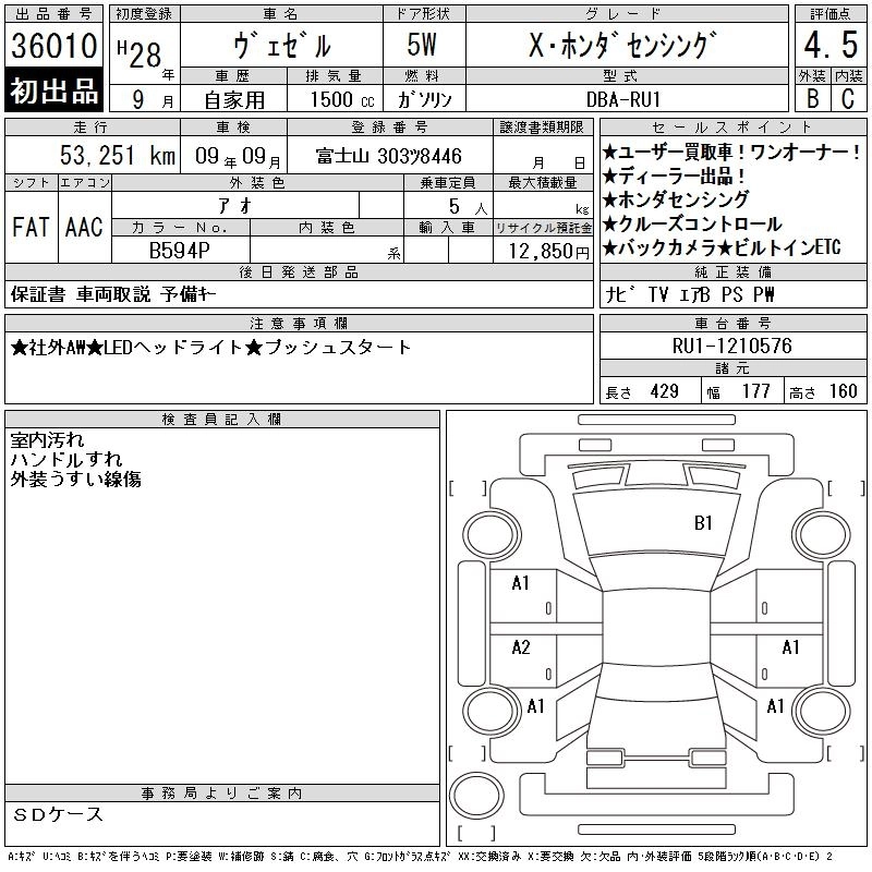 HONDA VEZEL 2016 г., лот № 36010