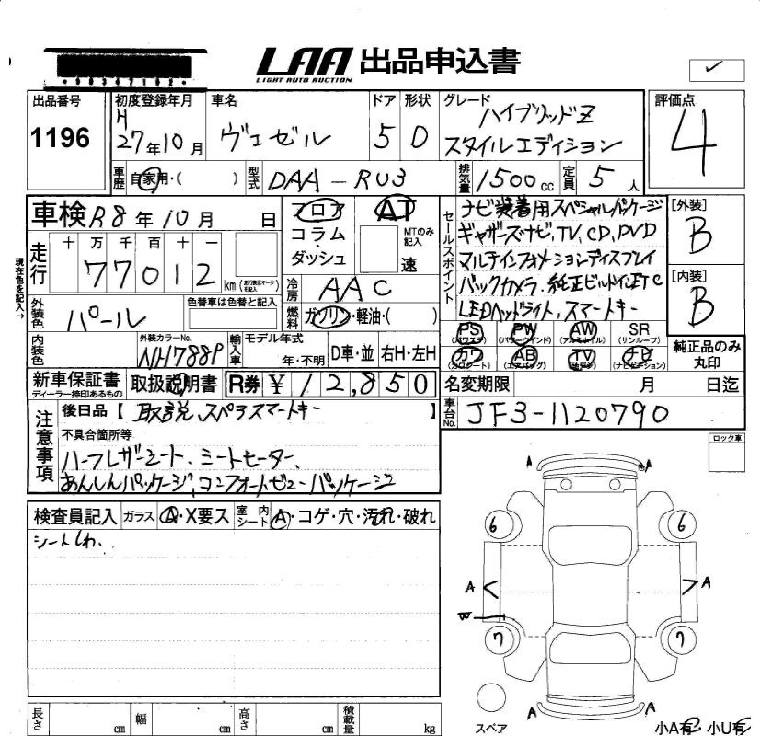 HONDA VEZEL 2015 г., лот № 1196