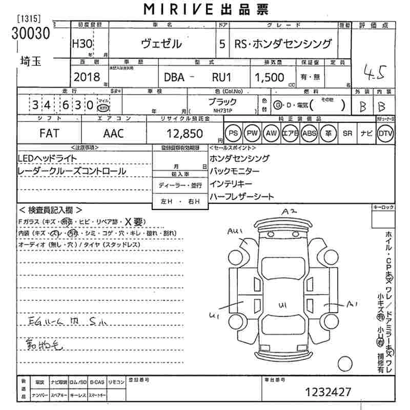 HONDA VEZEL 2018 г., лот № 30030