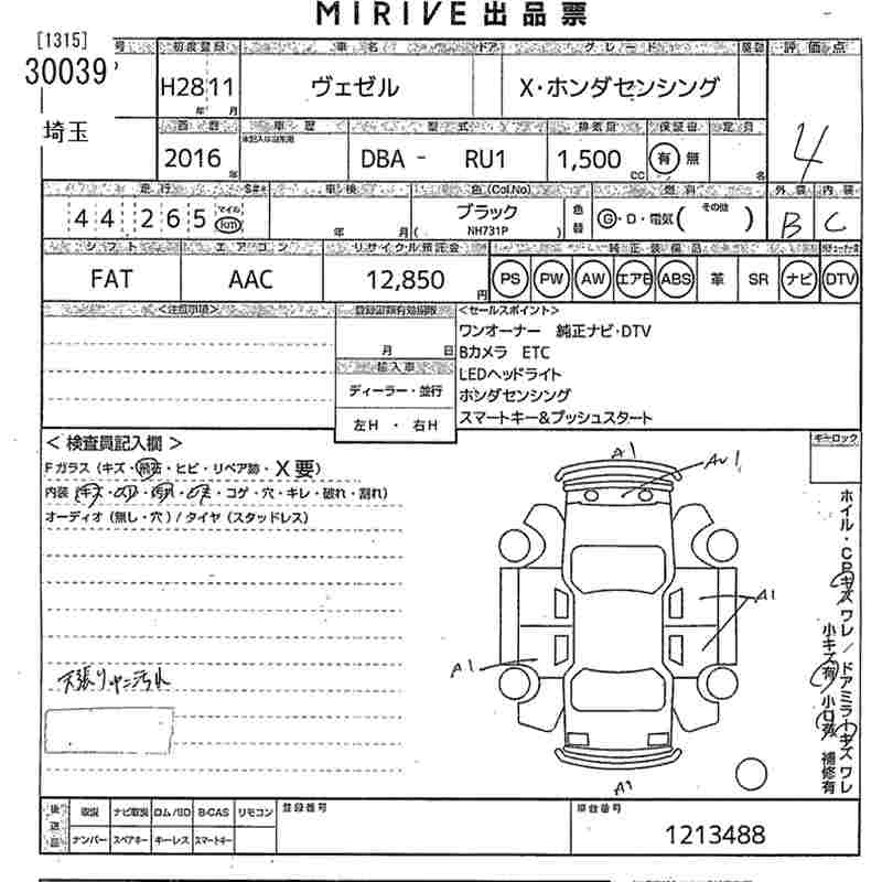 HONDA VEZEL 2016 г., лот № 30039