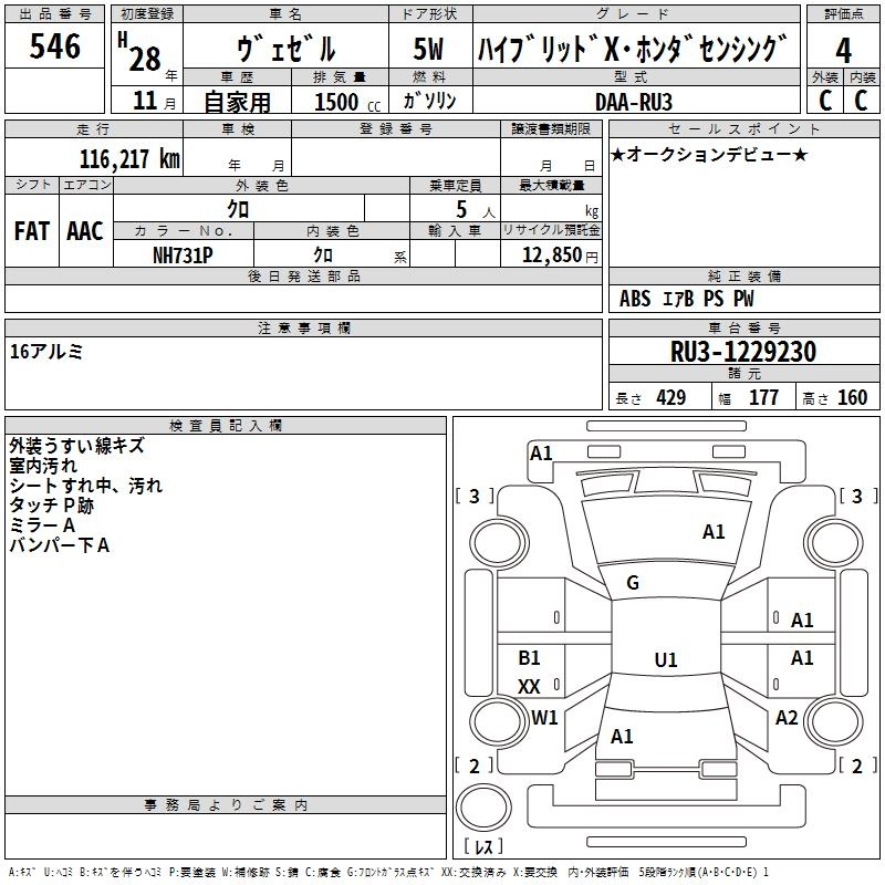 HONDA VEZEL 2016 г., лот № 546