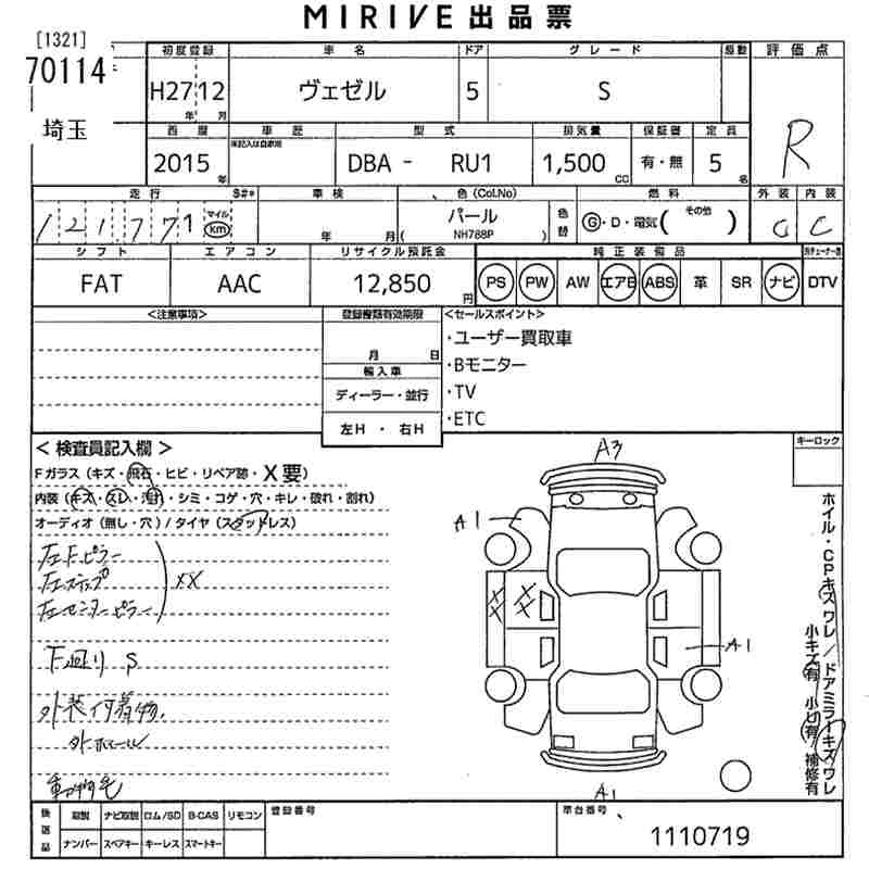 HONDA VEZEL 2015 г., лот № 70114