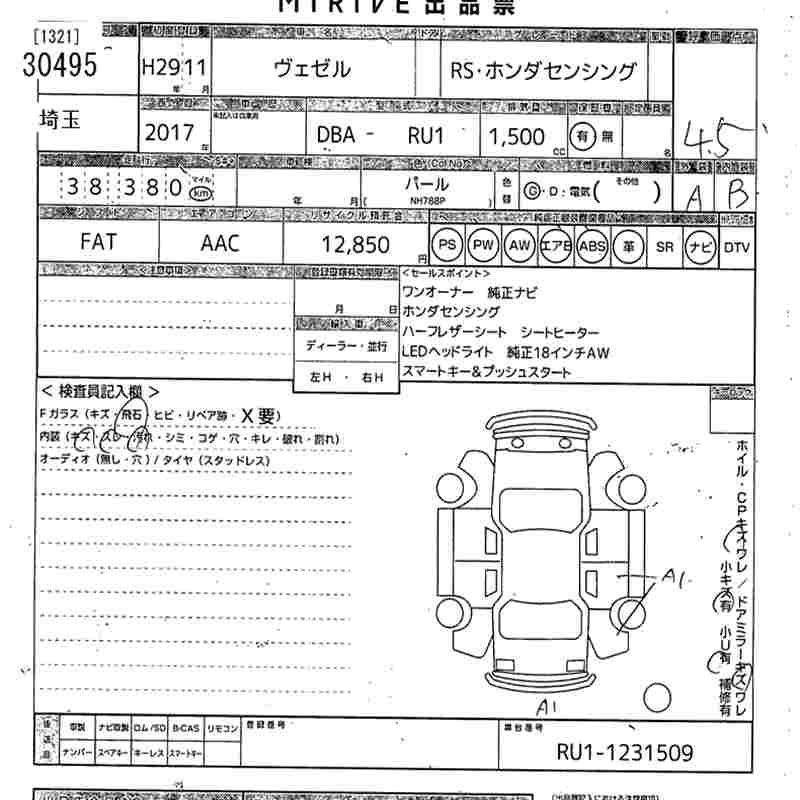 HONDA VEZEL 2017 г., лот № 30495