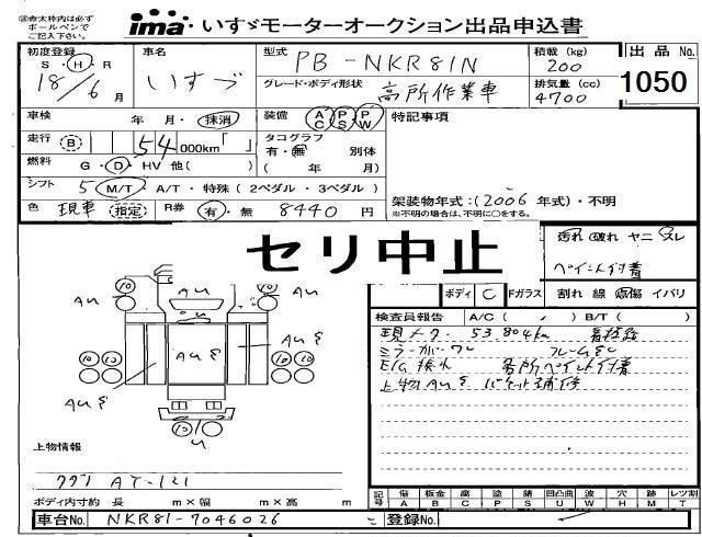 Год выпуска2006 Пробег 54 000 км КузовNKR81N Комплектация HIGH PLACE OPERATION CAR