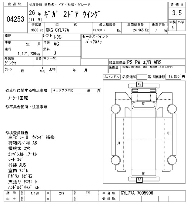 Год выпуска2014 Пробег 1 172 000 км КузовCYL77A Комплектация ALUMINIUM WING