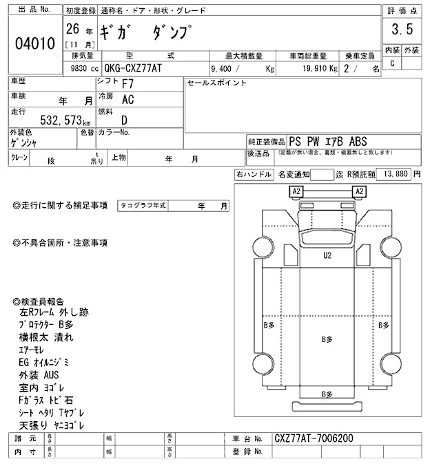 Год выпуска2014 Пробег 533 000 км КузовCXZ77AT Комплектация DUMP
