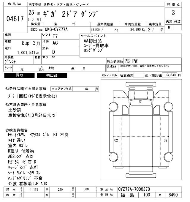 Год выпуска2013 Пробег 1 002 000 км КузовCYZ77A Комплектация DUMP