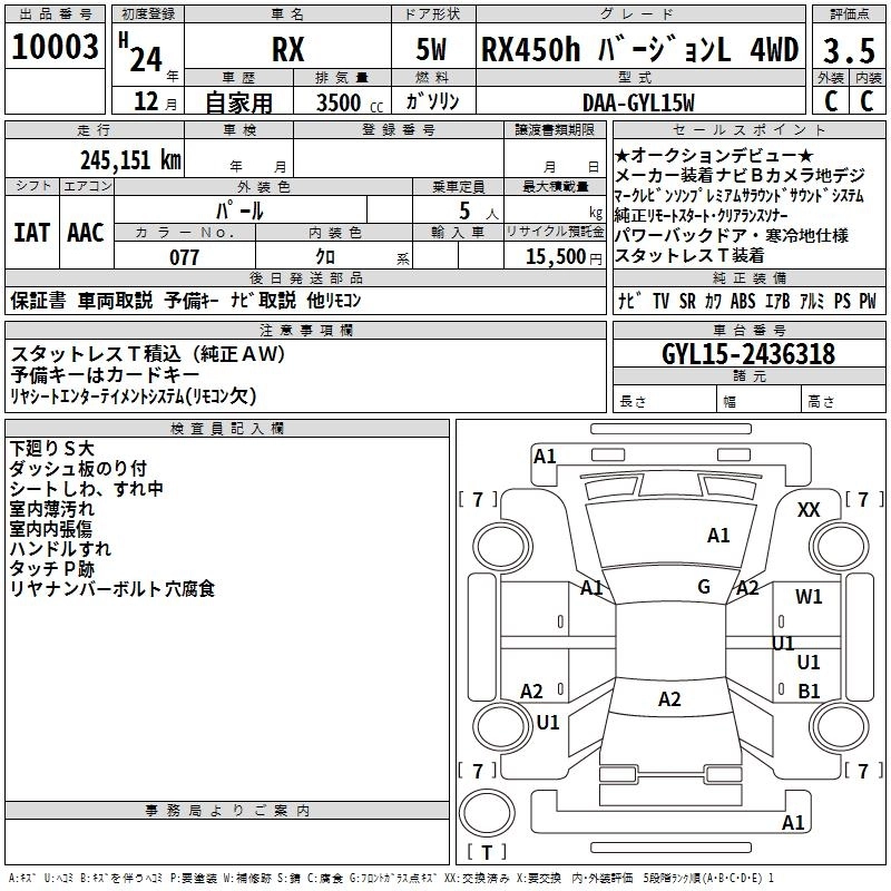 Год выпуска2012 Пробег 245 000 км КузовGYL15W КомплектацияRX450H VERSION L 4WD