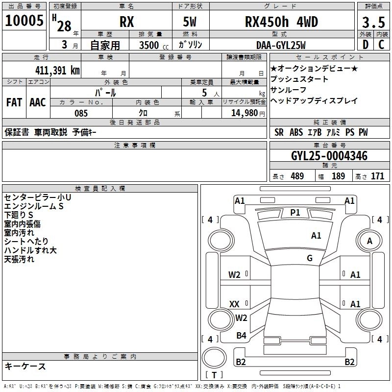 Год выпуска2016 Пробег 411 000 км КузовGYL25W КомплектацияRX450h 4WD