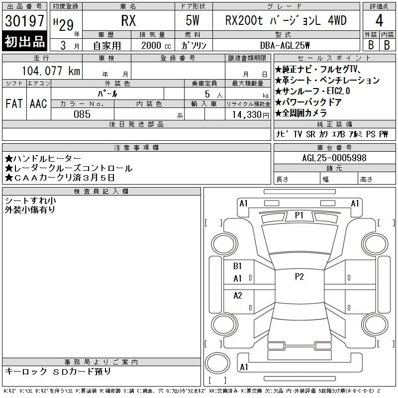 Год выпуска2017 Пробег 104 000 км КузовAGL25W КомплектацияRX200T VERSION L 4WD