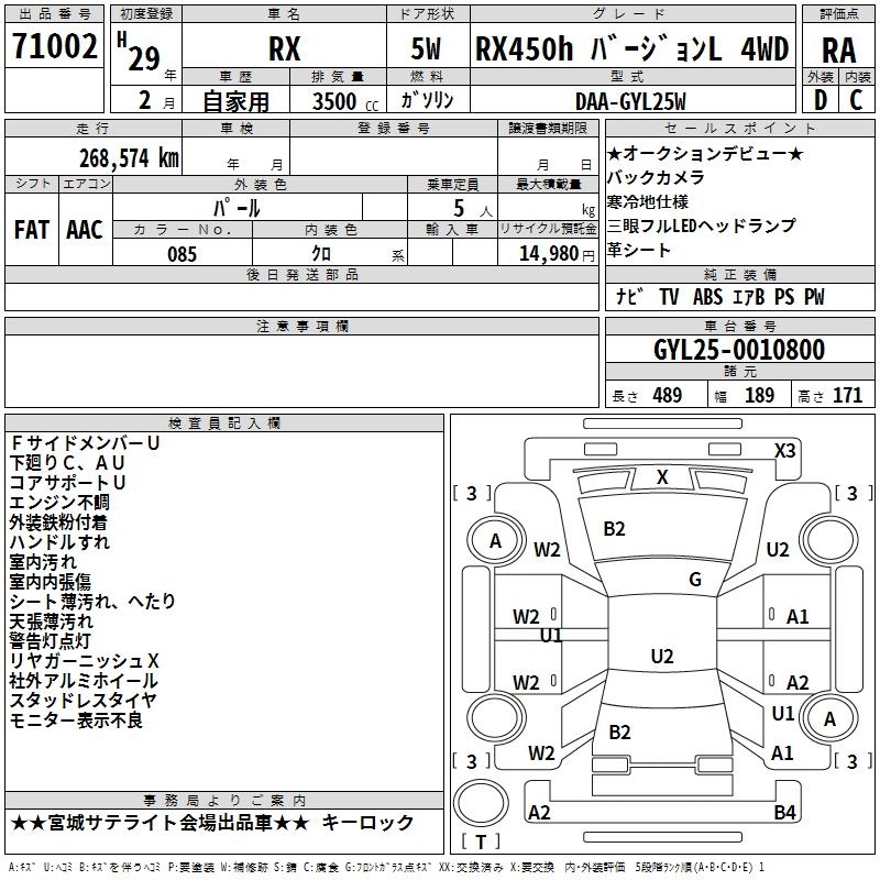 Год выпуска2017 Пробег 269 000 км КузовGYL25W КомплектацияRX450H VERSION L 4WD