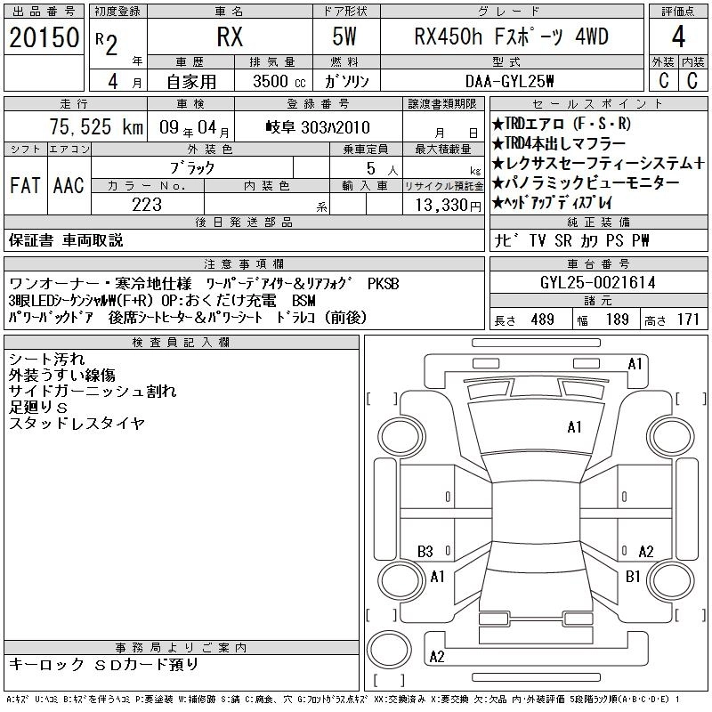 Год выпуска2020 Пробег 76 000 км КузовGYL25W КомплектацияRX450H F SPORT 4WD