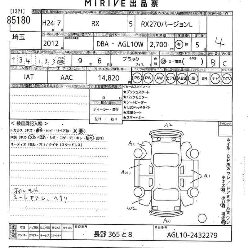 Год выпуска2012 Пробег 134 000 км КузовAGL10W КомплектацияRX270 VERSION L