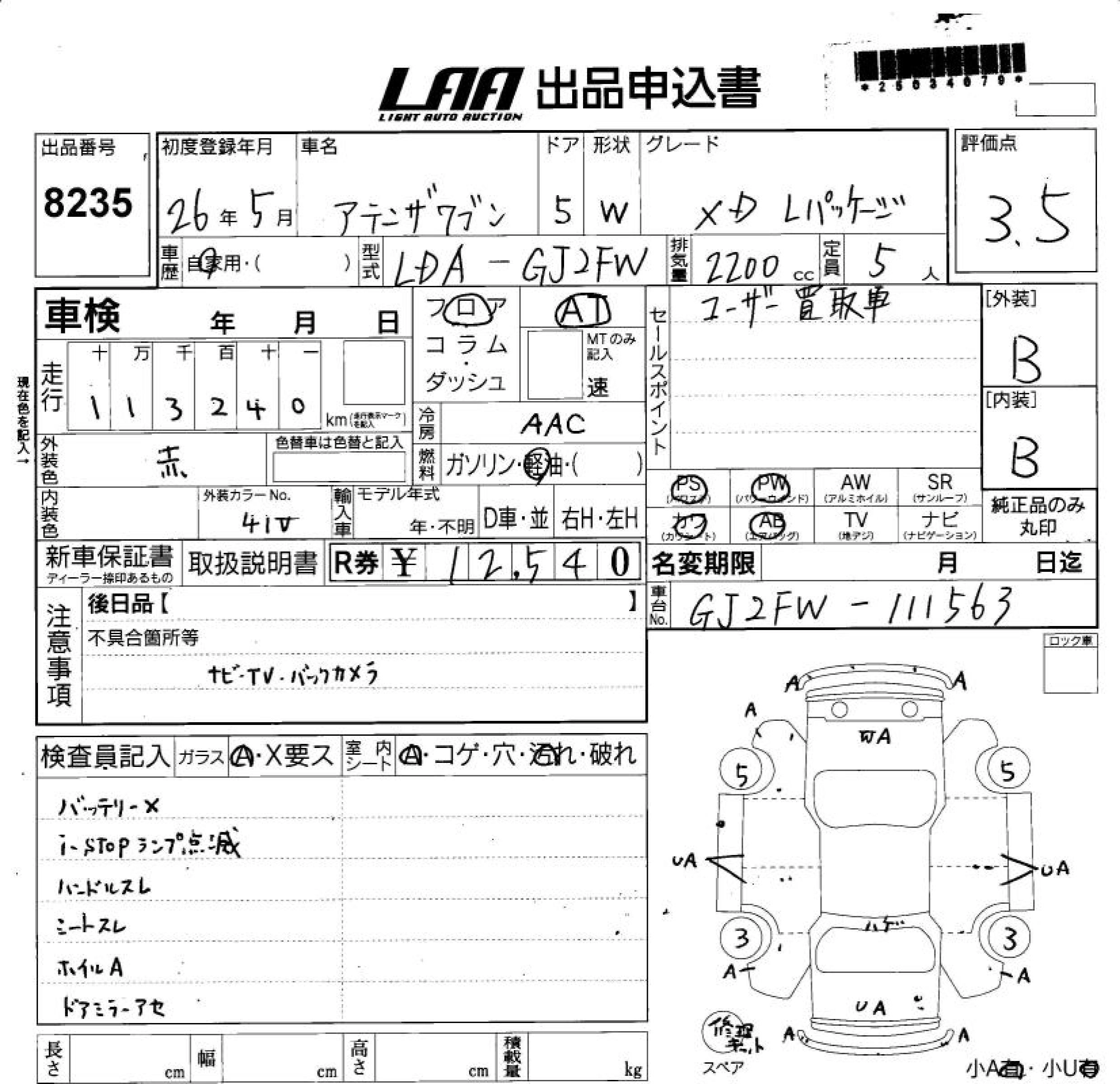 MAZDA ATENZA WAGON 2014 г., лот № 8235