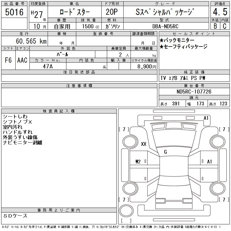 Год выпуска2015 Пробег 61 000 км КузовND5RC КомплектацияS SPECIAL PACKAGE