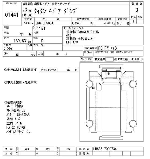 Год выпуска2011 Пробег 190 000 км КузовLHS85A Комплектация DUMP