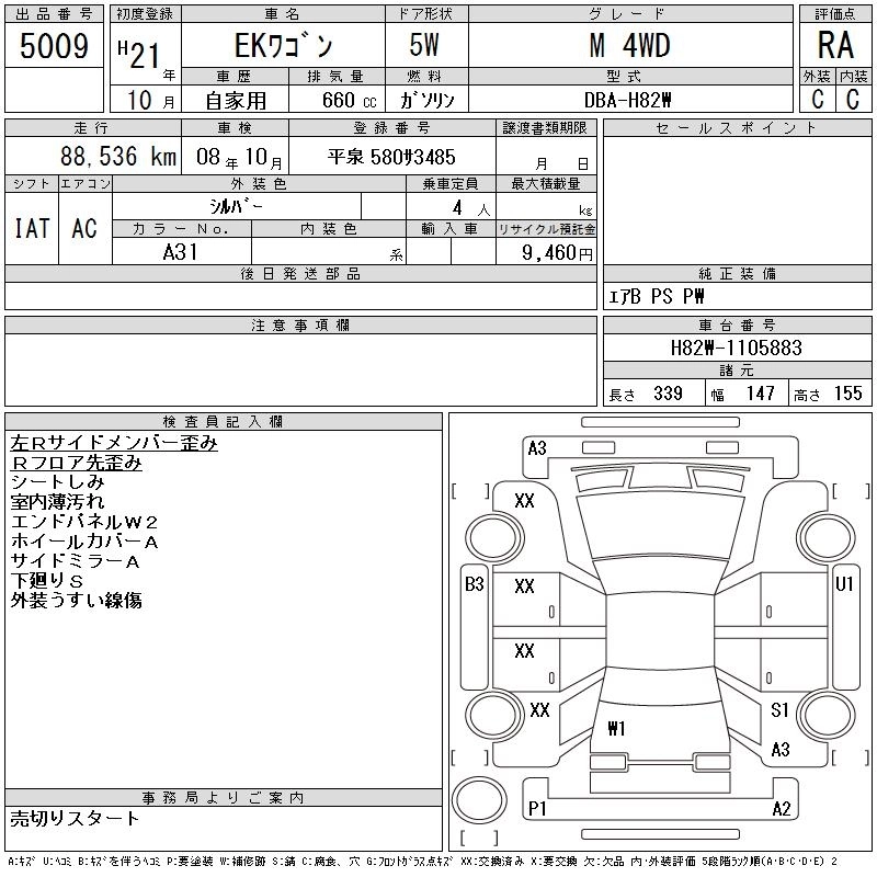 MITSUBISHI EK WAGON 2009 г., лот № 5009