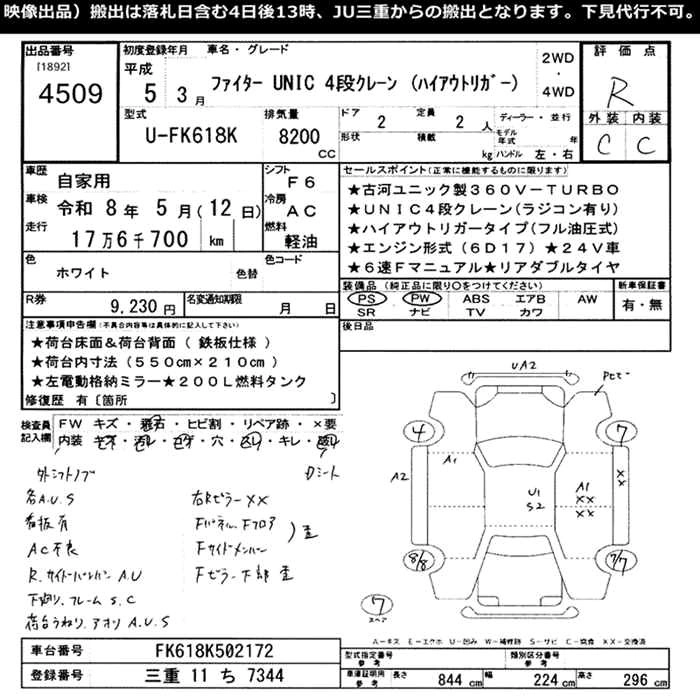 177 000 км КузовFK618K КомплектацияUNIC 4 STEPS CRANE ( ASH OUTRIGGER )