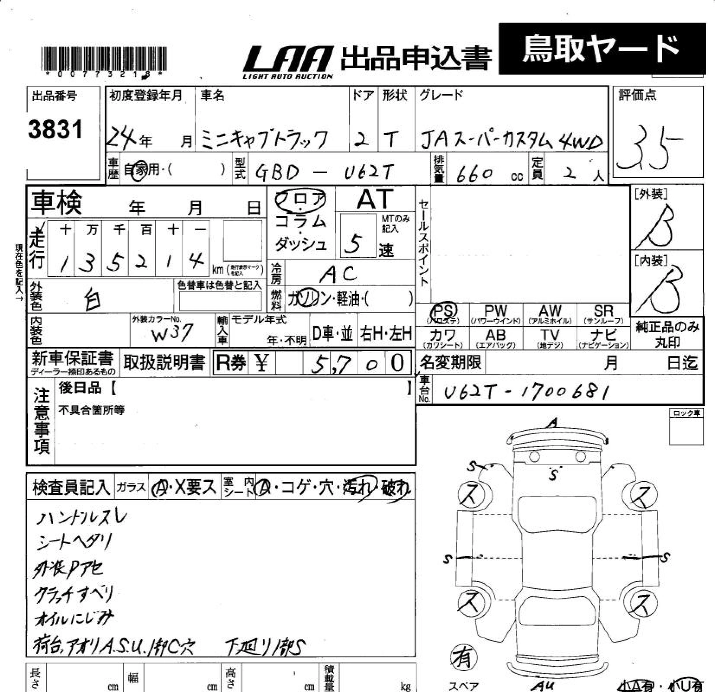 Статус не продан Лот 3831 Аукцион LAA Okayama Дата аукциона 23.01.2026